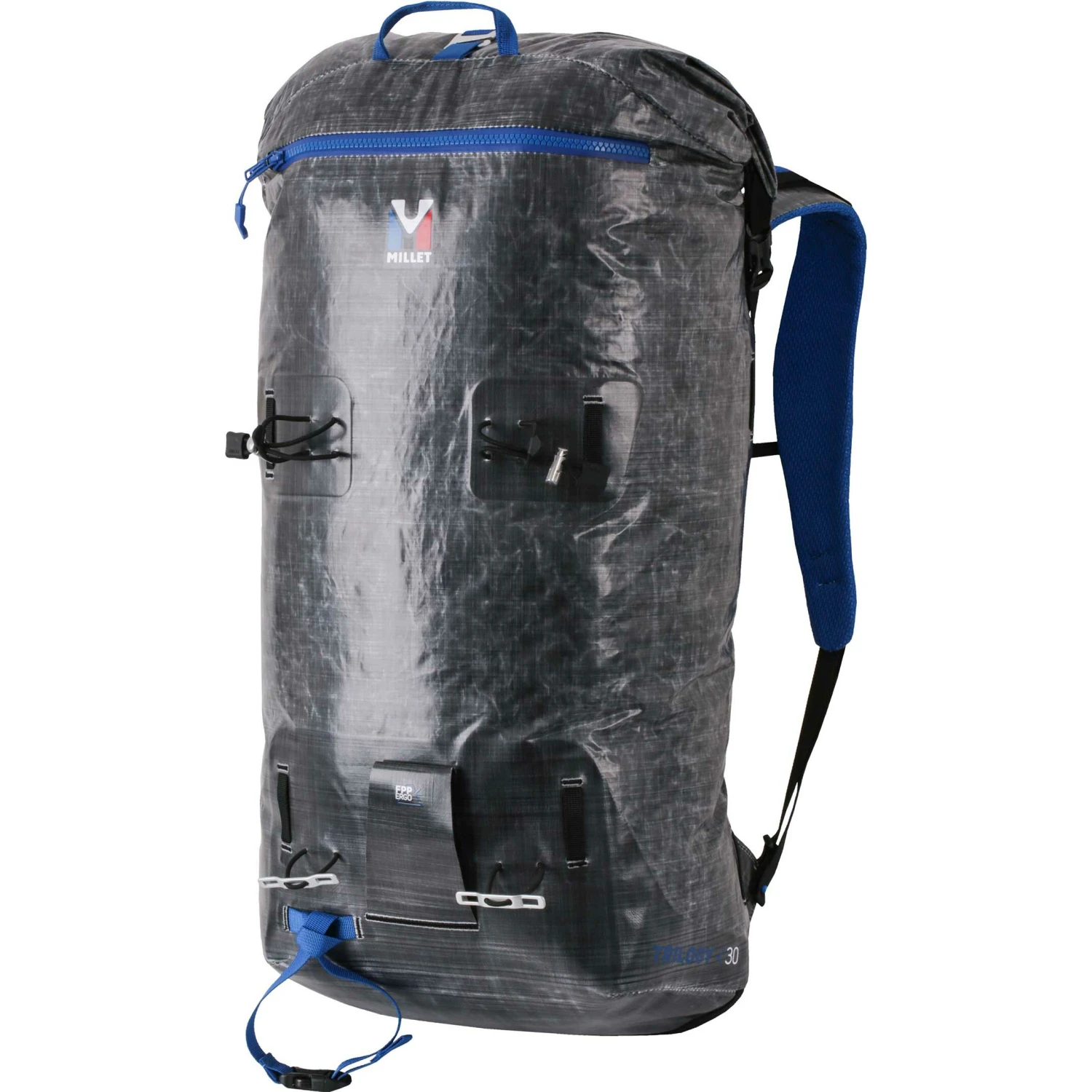Le Trilogy 30 de Millet est un sac à dos d’une capacité de 30L conçu pour l’alpinisme et le ski-alpinisme. Ce poids plume pourra accueillir des expéditions de plusieurs jours. Le tissu, qui a une colonne d’eau de 20.000 mm, est tissé avec du Dyneema, le fil le plus résistant disponible. L’objectif principal de ce sac à dos est d’obtenir le meilleur rapport résistance/poids et cela grâce à un design minimaliste utilisant la technologie de production. Les sangles sont multifonctionnelles et/ou rétractables (sangle de compression, ceinture de hanche, porte-matériel (ski et piolet)) et une poche latérale zippée donne un accès direct à la charge. Pour assurer une stabilité maximale sur les terrains raides et techniques, le panneau dorsal allie structure et confort.